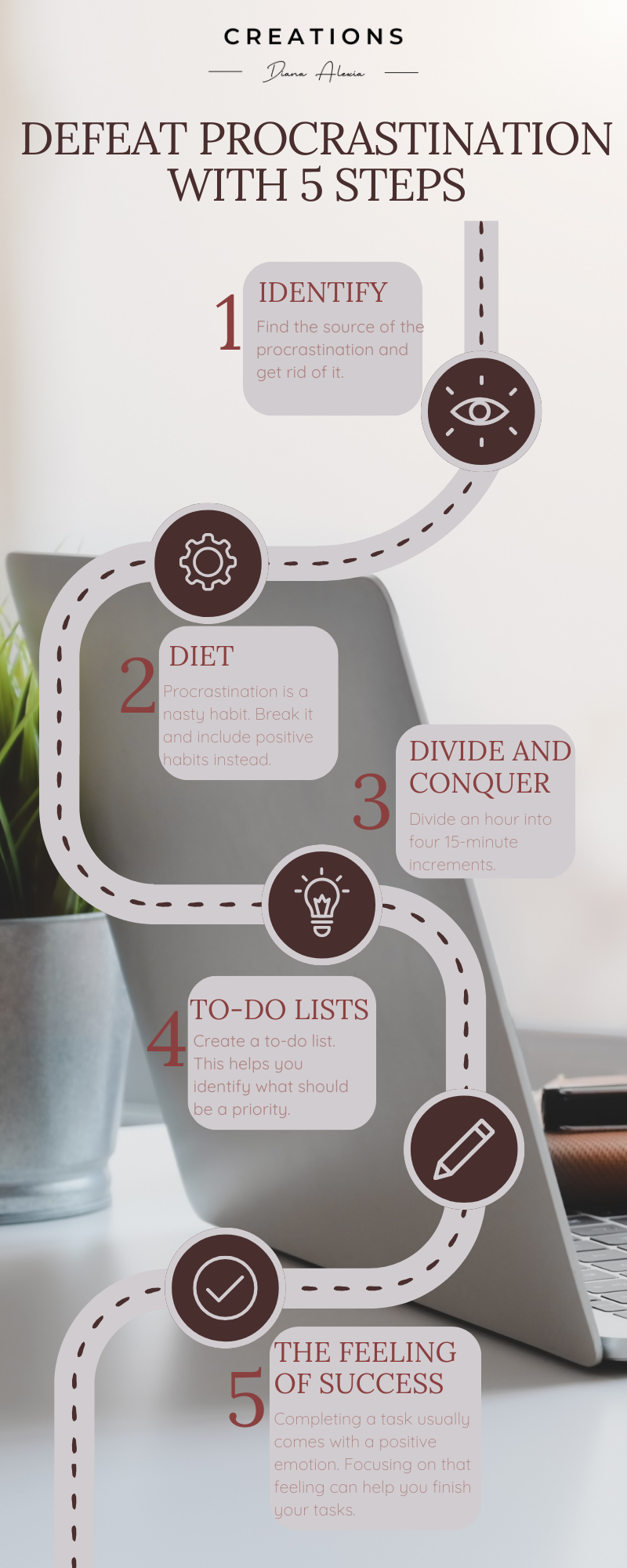 There is a load of information online to help you with procrastination. Unfortunately, it is common in today’s society to find oneself distracted by social media, ads, and even just by thinking of everything that must be completed by the end of the day. While tasks and projects can feel overwhelming to start, keeping an end goal in mind makes it easier to move forward than just wishing the day would be over.